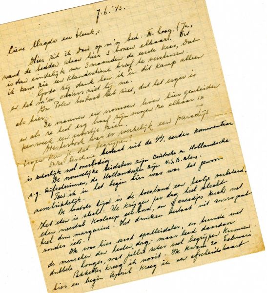 I arrived here on February 20th and at the beginning of April I received a farewell card from my mother. A few days later your first large parcel arrived. I was delighted beyond words and was extremely grateful. From then on De Telegraaf followed on a fairly regular basis, 3 to 4 times a week; the censor appeared to withhold the rest. A week later I received another parcel from you and that was also wonderful. The cigarettes were particularly criminal. What I need most is bread, butter, sugar, jam and cigarettes. Everything else is welcome but not essential. If you send tins of milk or porridge the censor confiscates them.