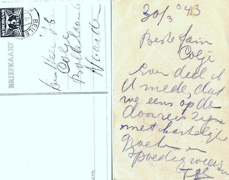 March 30, 1943 The last sign of life from Rosie’s father To Magda and Henk Coljee Bollenlaan 6 Naarden Just to let you know we’re in transit. Best regards, and hope we see each other again soon. Falk Glaser