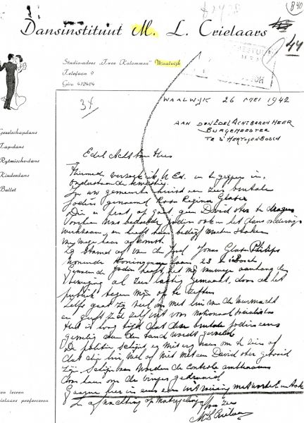 A very impertinent Jewish woman by the name of Rosa Regina Glaser lives in your city and she prides herself on not wearing a Star of David. The said Jewess was also active as a dance teacher and was forced to put an end to her activities on account of her background. She is the daughter of Falk Jonas Glaser Philips, a Jew residing at Koninginnelaan 23 in ’s-Hertogenbosch.